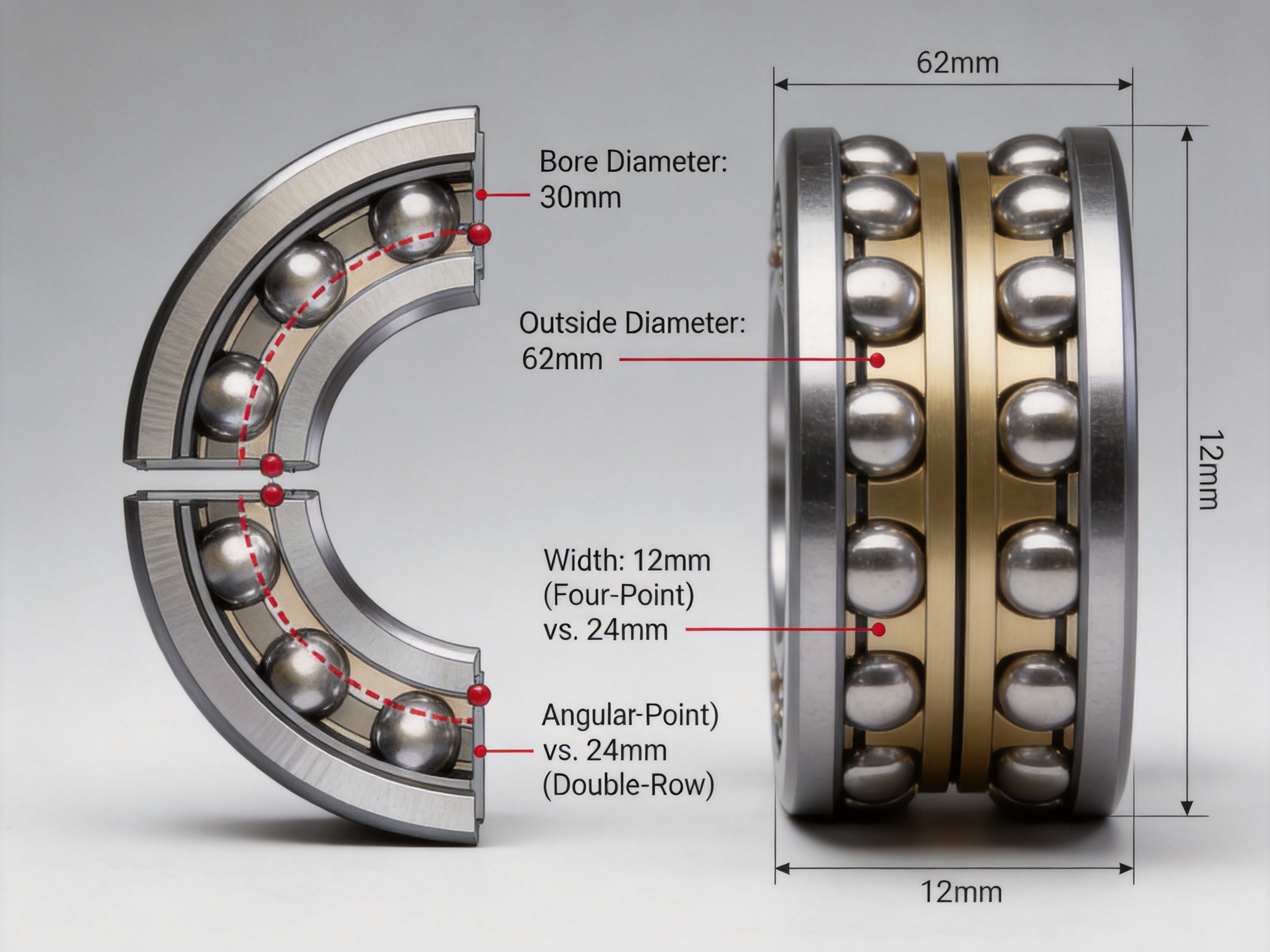 Below is a curated table of four-point contact angular contact ball bearing models, including their designation, bore diameter, outside diameter, width, basic dynamic load rating, and limiting speed: