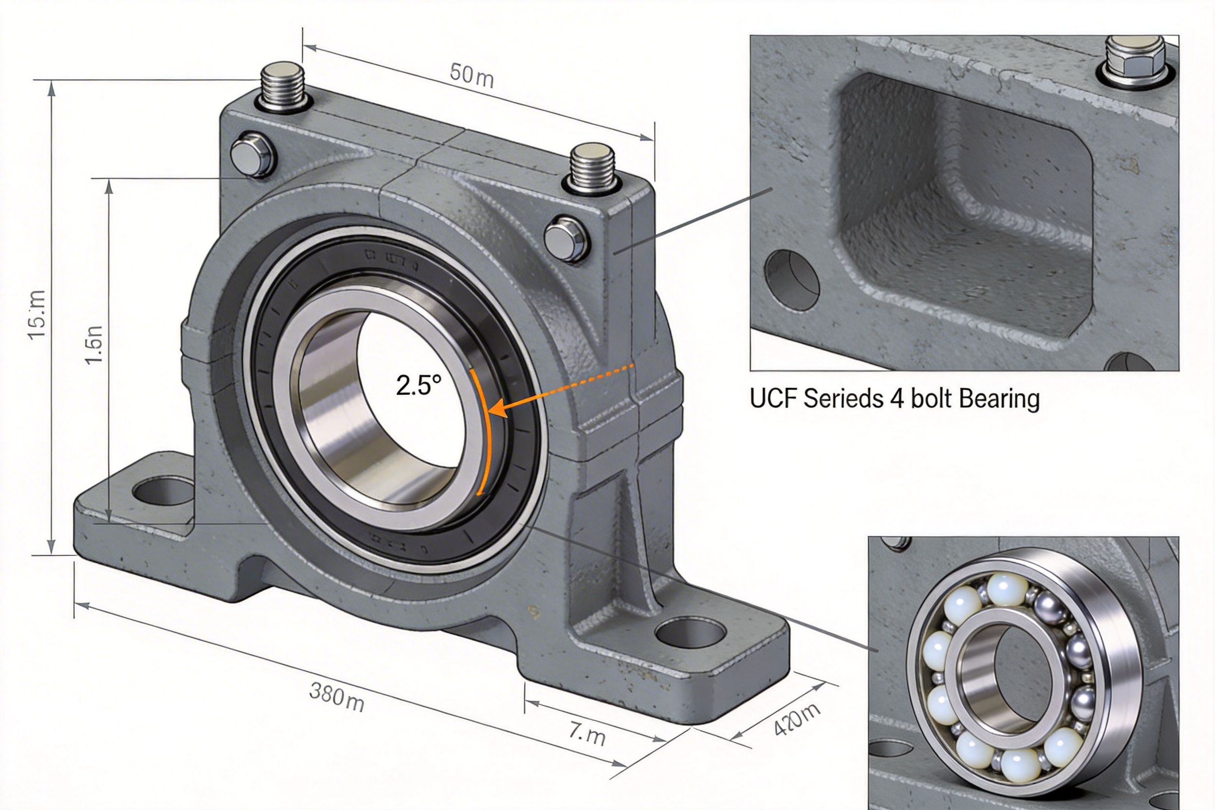 Self-Aligning Capability: The spherical- concave interface enables the bearing to compensate for up to 2.5 degrees of angular misalignment. This is critical in applications where perfect shaft-housing alignment is difficult to maintain, such as conveyor systems or robotic arms. By reducing stress from misalignment, the UCF series extends the bearing’s service life and minimizes downtime.