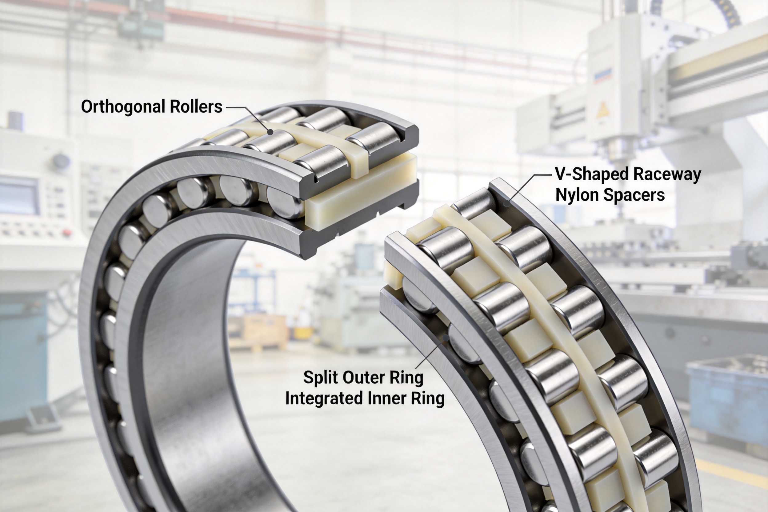 Cross roller bearings are characterized by their unique arrangement of cylindrical rollers: two rows of rollers are placed orthogonally (at 90 degrees) on V-shaped raceways, separated by nylon spacers. This configuration allows the bearing to distribute loads evenly across multiple contact points, reducing stress and extending lifespan. The design also minimizes friction, enabling smooth, low-torque rotation even under heavy loads.