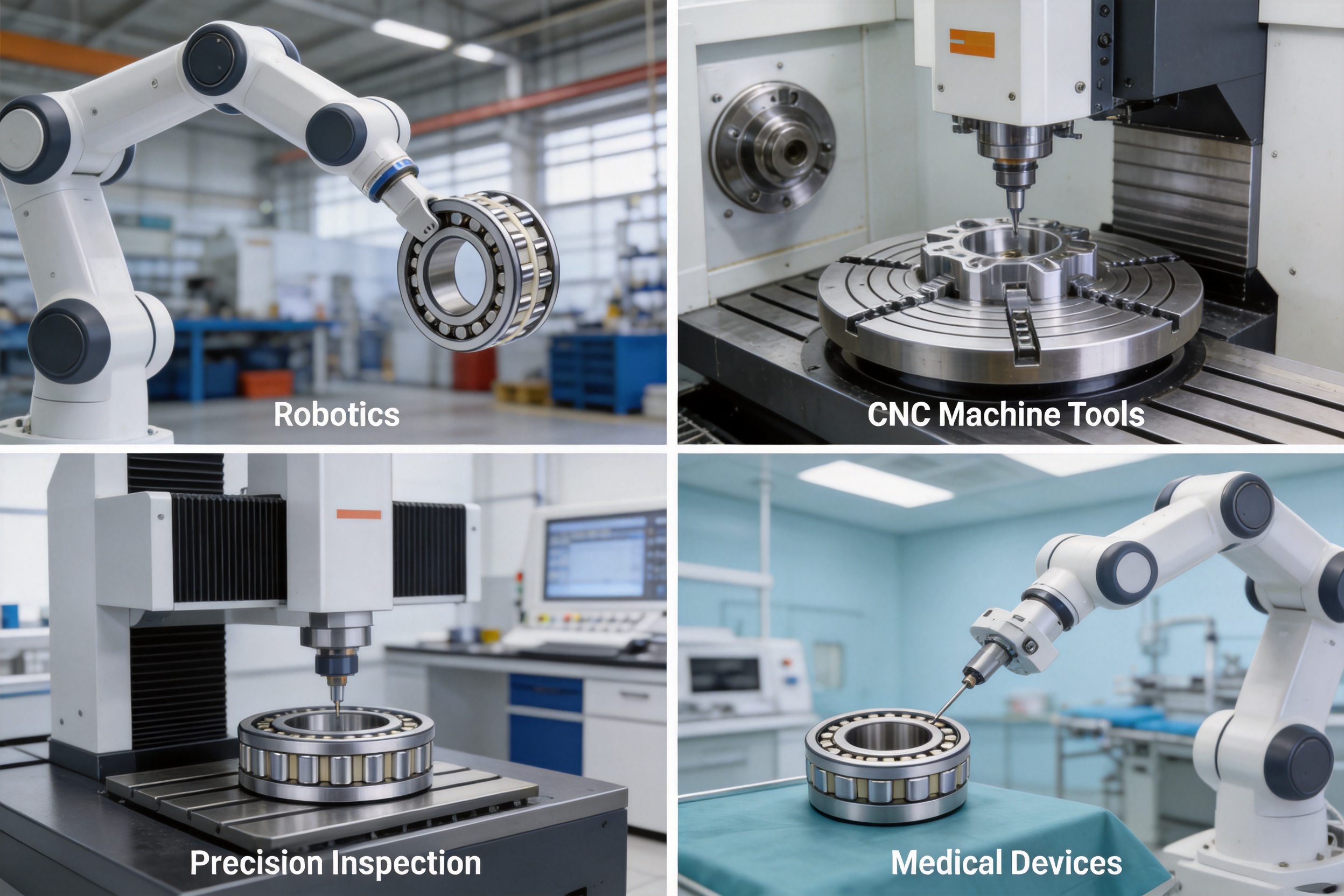 A: Cross roller bearings are used in a wide range of industries, including: - Robotics (industrial and collaborative robots) - CNC machine tools (indexing tables, lathes) - Precision inspection instruments (CMMs, optical comparators) - Medical devices (surgical robots, diagnostic equipment) - Aerospace (actuators, gimbals) - Automotive (steering systems, transmission components)