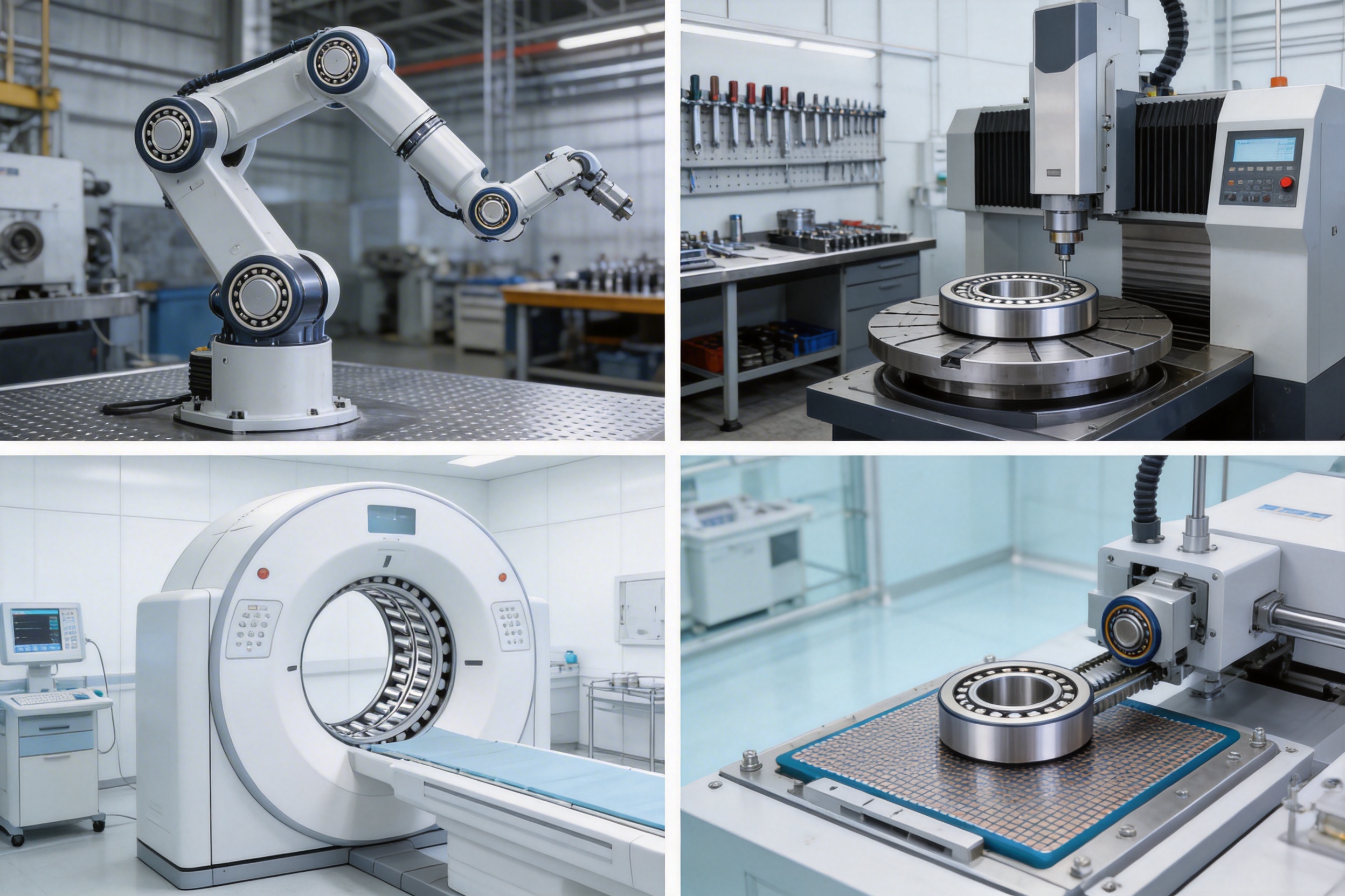 Semiconductor manufacturing (e.g., IC production, wafer processing) requires ultra-precision bearings: